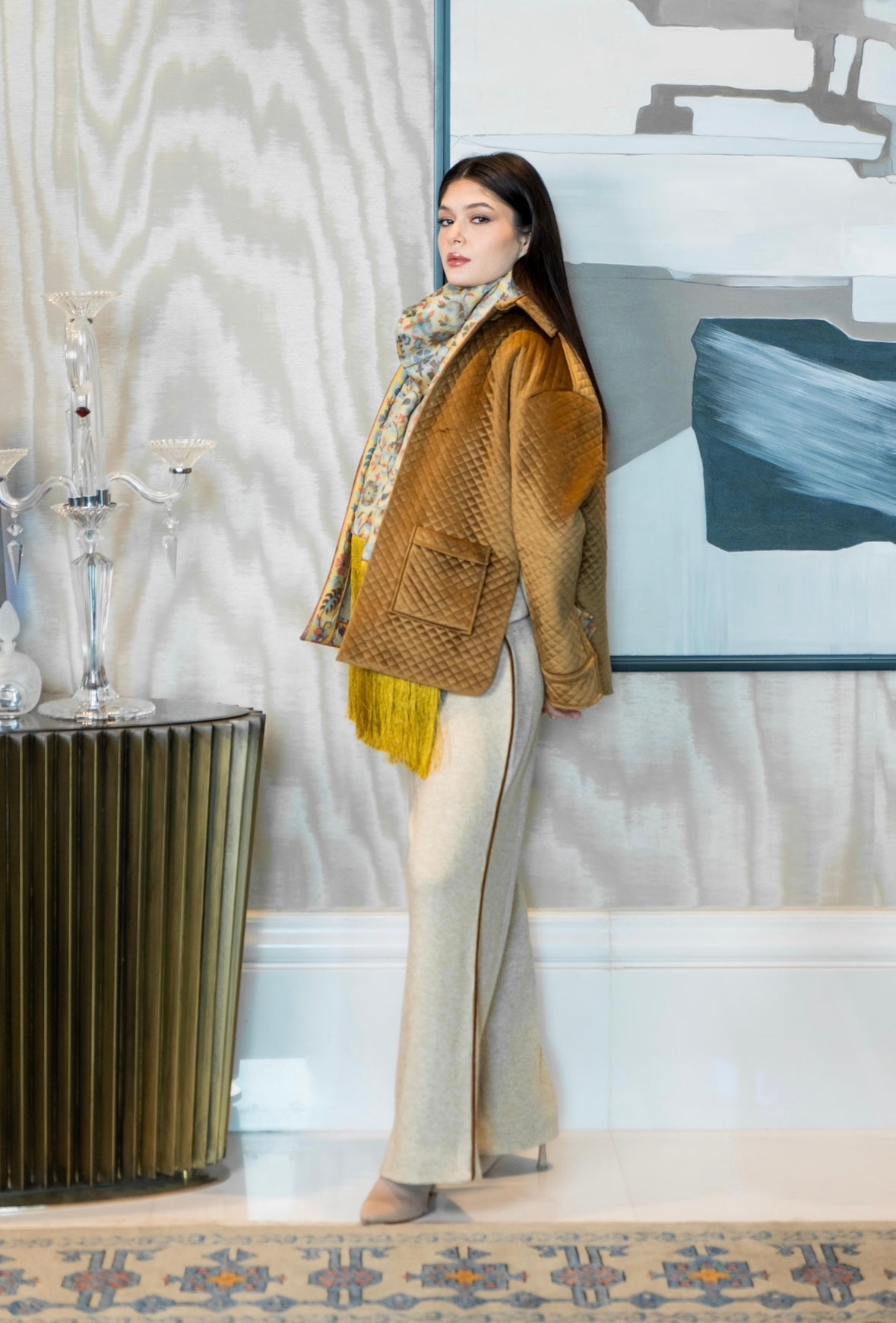 jacket, top, pants, and a reversible (double-sided) shawl.